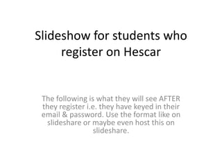 After registering on the Hescar site, students are shown the many course and university options available to them across 8 countries. They can search over 8,000 courses at 100 universities by country, course type, or with advanced search options. For example, a search for a Bachelor's in Accounting in Australia returns 13 matching universities. Students can then view detailed information on individual courses, universities, and compare up to 3 options side by side to help decide.