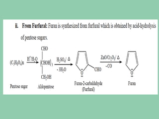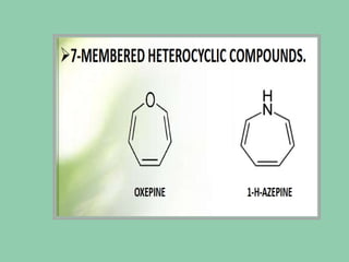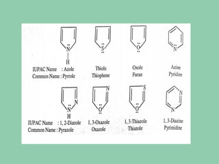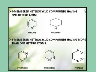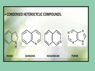 The document discusses heterocyclic compounds, which are cyclic compounds containing at least one atom other than carbon in the ring, such as nitrogen, oxygen, sulfur, or phosphorus. These compounds include lactones, alkene oxides, cyclic anhydrides, alkaloids, proteins, and enzymes. The document covers the classification, nomenclature, methods of preparation, structure, and examples of heterocyclic compounds like furan, pyridine, and indole.