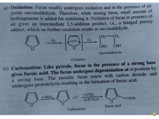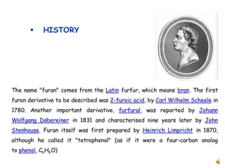 Furan is a colorless, flammable and volatile liquid with a five-membered aromatic ring containing four carbon atoms and one oxygen atom. It melts at -85.6°C and boils at 31.3°C. Furan and its derivatives have a variety of medical uses, including as antimicrobial, anti-inflammatory, and diuretic agents. Commercially, furan is prepared by acid hydrolysis of pentosans from agricultural waste into furfural, which can then be reduced to furan.