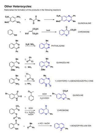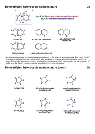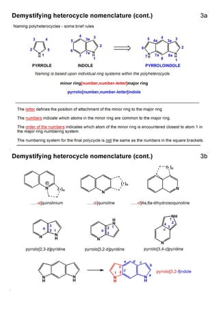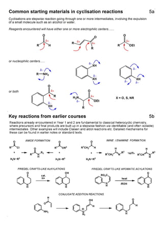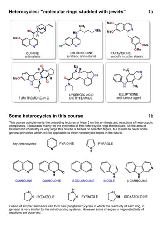 1. The document outlines the contents and learning outcomes of a course on heterocyclic chemistry in two parts. Part 1 covers the introduction and structures of various heterocycles. Part 2 focuses on 1,3-dipolar cycloaddition reactions and specific heterocycles like isoxazoles.