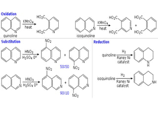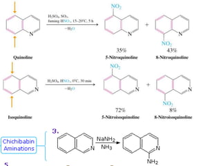 The document discusses several heterocyclic compounds including quinolines, isoquinolines, and indoles. It summarizes key reactions used to synthesize these compounds, including the Combes, Friedlander, Knorr, and Skraup reactions for quinoline synthesis. It also discusses the Bischler-Napieralski, Pictet-Spengler, and Pomeranz-Fritsch reactions for isoquinoline synthesis and the Fischer, Madelung, and Reissert reactions for indole synthesis, along with mechanisms and examples of each reaction. Reactivity and substitution patterns are also covered for quinolines, isoquinolines and indoles.