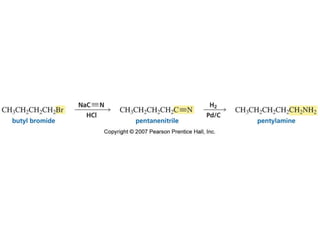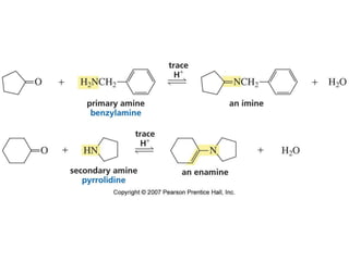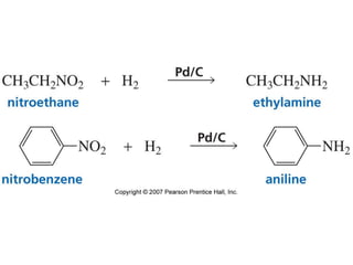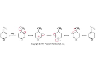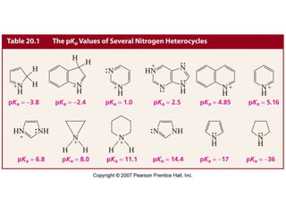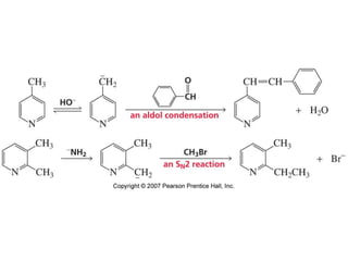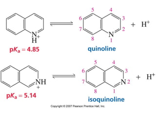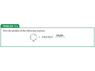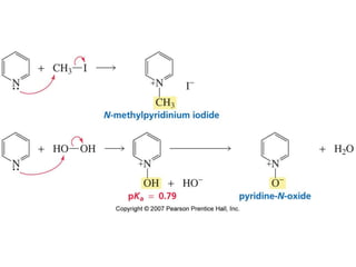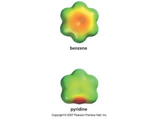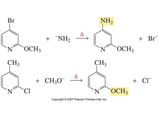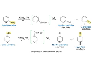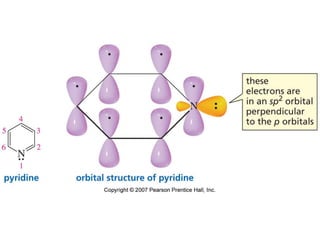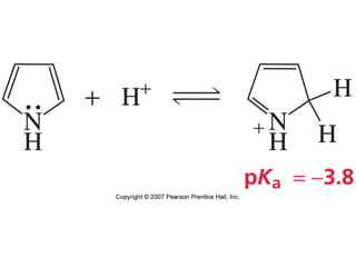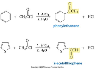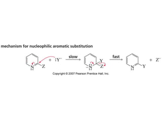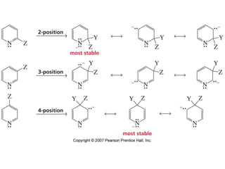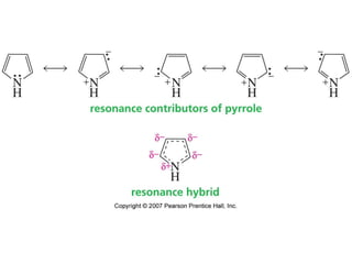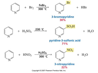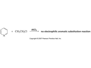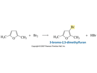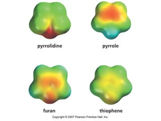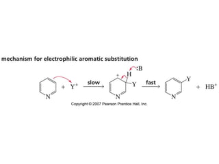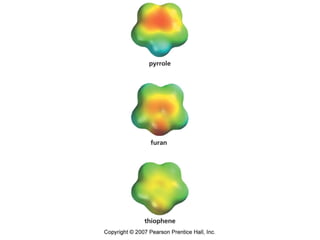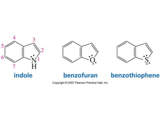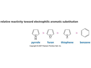 The document summarizes electrophilic substitution reactions of various aromatic heterocyclic compounds. For pyrrole, substitution prefers the 2-position and reagents include nitric acid, chlorine, and acetic anhydride. For furan, substitution occurs at the 2 and 5-positions. For benzothiophene, substitution prefers the 2-position with reagents like nitric acid and chlorine. Polymerization can occur under acidic conditions for pyrrole. Indole substitution prefers the 3-position and is deactivated by electron-withdrawing groups. For benzofuran, substitution occurs at the alpha position rather than beta due to oxygen's directing effect.