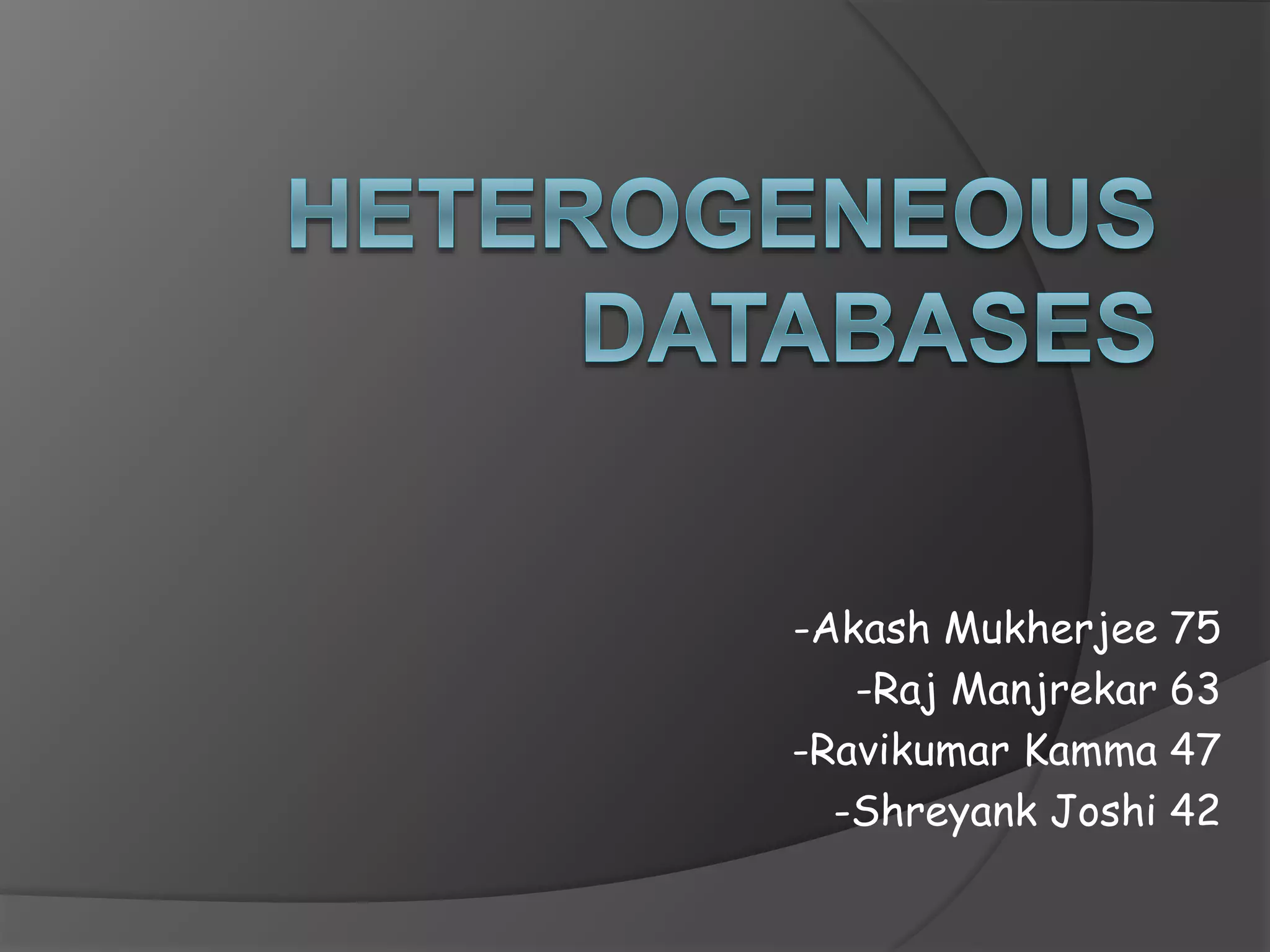 This document discusses heterogeneous database systems. It defines a heterogeneous database system as an automated or semi-automated system that integrates disparate database management systems to present a unified query interface to users. It discusses issues in multi-database query processing such as query support, cost, translation and change adaptation. The architecture involves individual databases, wrapper methods, a mediator and query processing/optimization. Database integration involves schema integration through a bottom-up design approach and the conversion of local schemas to a global schema.
