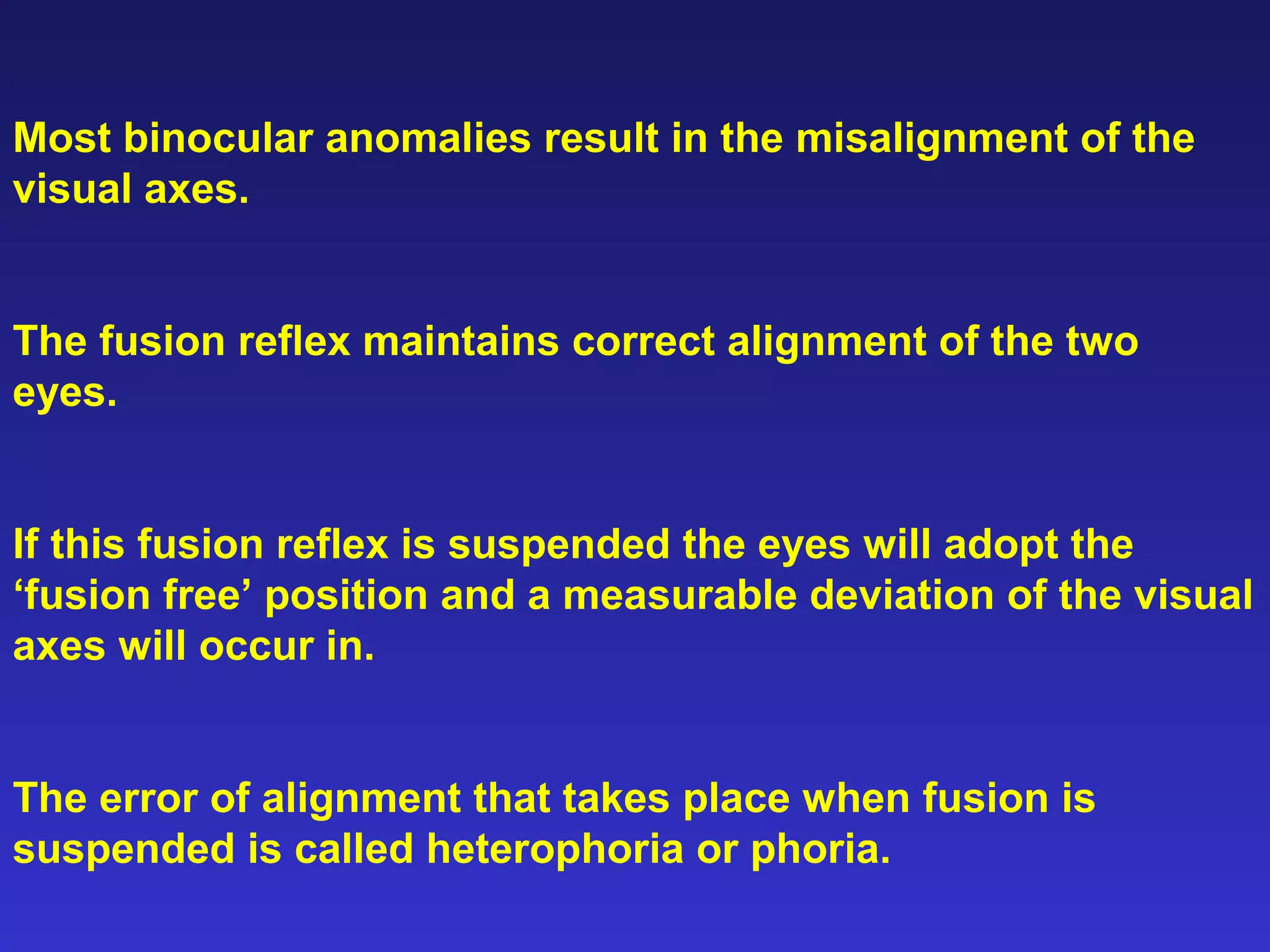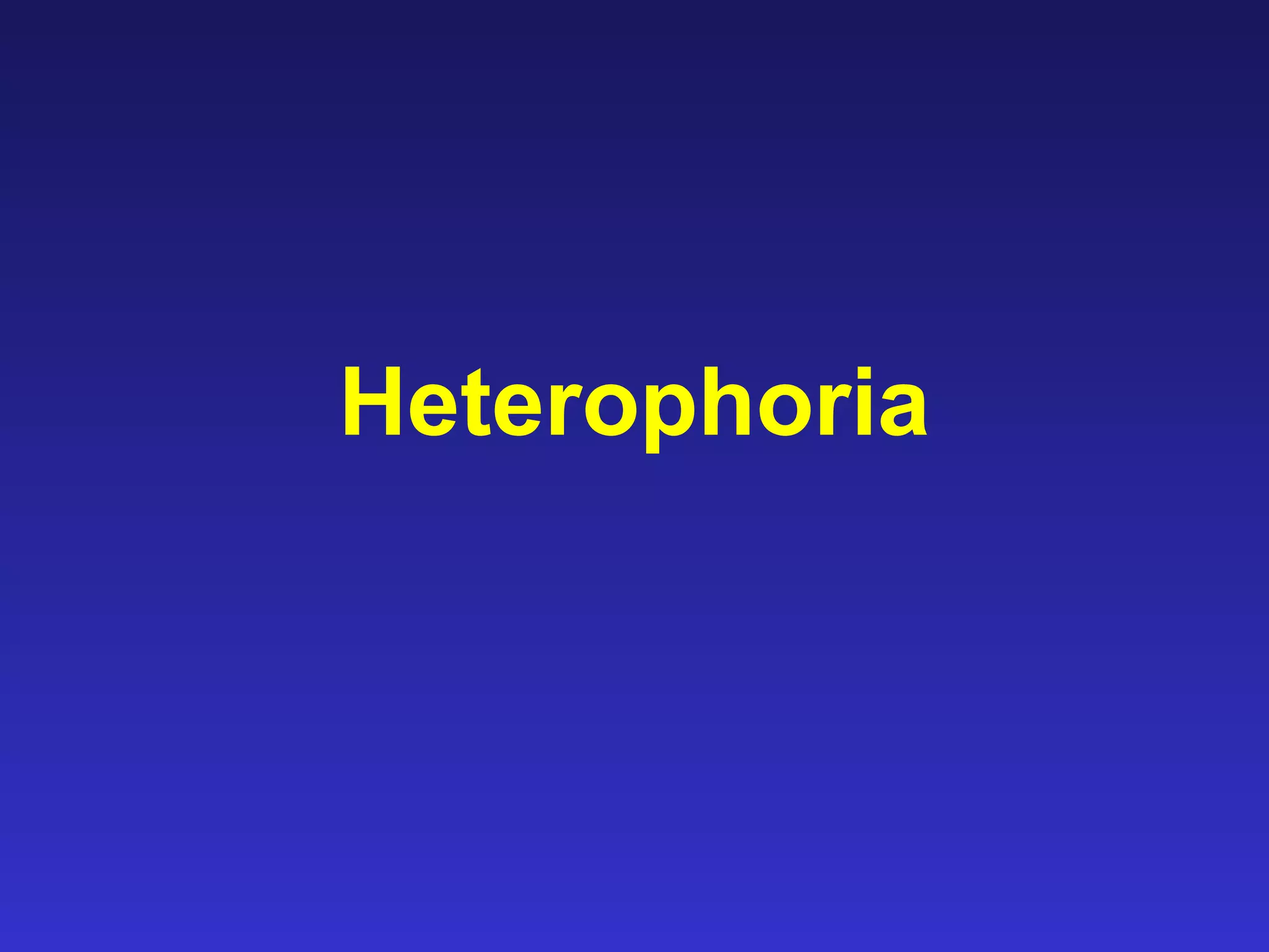 Heterophoria refers to a latent misalignment of the visual axes that is corrected by the fusion reflex. When fusion is suspended, the eyes adopt their "fusion free" position, which may involve esophoria, exophoria, or hyperphoria. Heterophorias can be classified based on direction, fixation distance, compensated vs decompensated state, and cause such as anatomical, neurogenic, or accommodative factors. Most people have some degree of heterophoria, though large or decompensated heterophorias may cause symptoms like asthenopia or headaches.