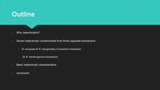 Seven heterotrophic contaminants were isolated from three nitrifying bioreactors. The contaminants were identified via PCR amplification and sequencing of the 16S ribosomal subunit. From a Nitrobacter hamburgensis bioreactor that crashed, two contaminants were isolated and identified as Gordonia terrae and Microbacterium oxydans. From a stable N. hamburgensis bioreactor, one contaminant was isolated and identified as Bacillus horikoshii. From a Nitrosomonas europaea and Nitrobacter winogradskyi consortium bioreactor, four contaminants were isolated - Shinella zoogloeoides, Flavobacterium lindanitol