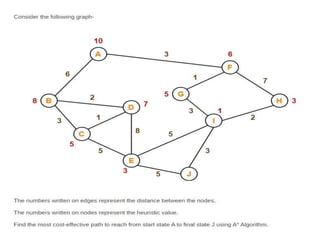 The document discusses various heuristic search algorithms used in artificial intelligence including hill climbing, A*, best first search, and mini-max algorithms. It provides descriptions of each algorithm, including concepts, implementations, examples, and applications. Key points covered include how hill climbing searches for better states, how A* uses a cost function to find optimal paths, and how best first search uses a priority queue to search nodes in order of estimated cost to reach the goal.