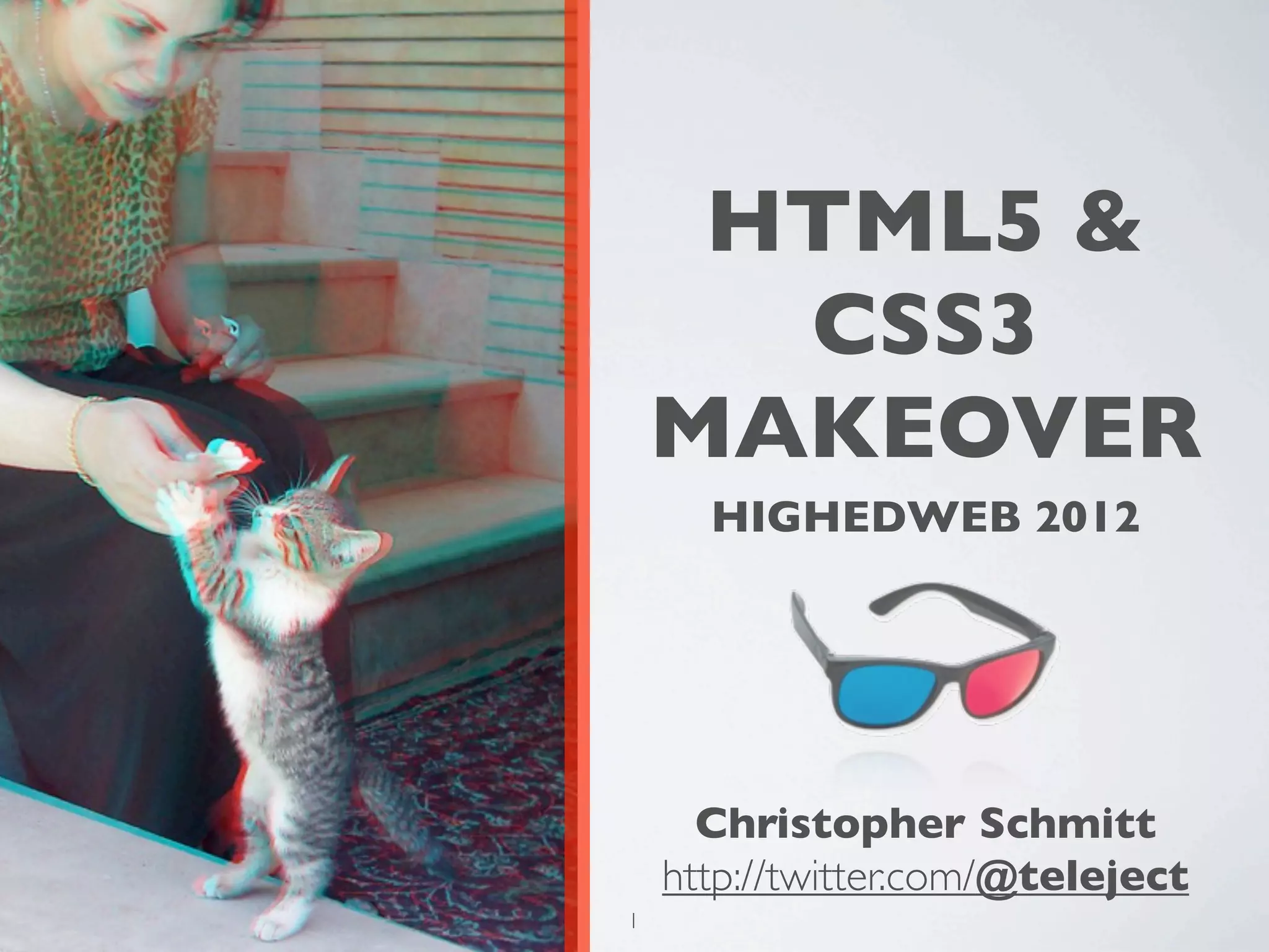 This document provides an agenda and overview for a presentation on CSS3 features including new selectors, properties, and techniques for cross-browser compatibility. It explores CSS3 modules like color, opacity, text effects, fonts, shadows, borders, and images. The presentation examines properties such as RGBA, text-overflow, text-selection, columns, @font-face, text-shadow, box-shadow, border-image, and techniques for implementing these features across browsers. Lessons are provided on browser support and workarounds for older browsers.
