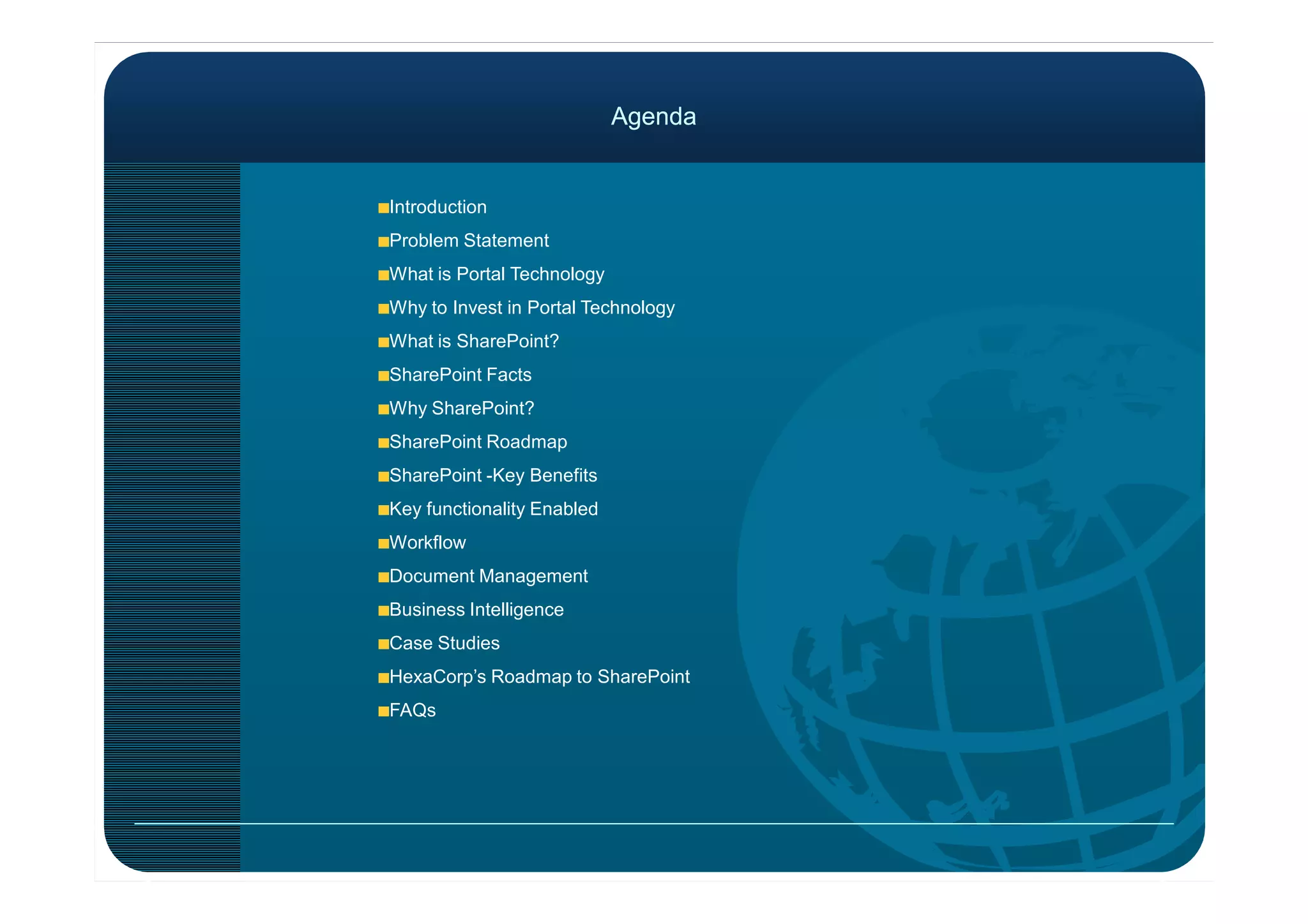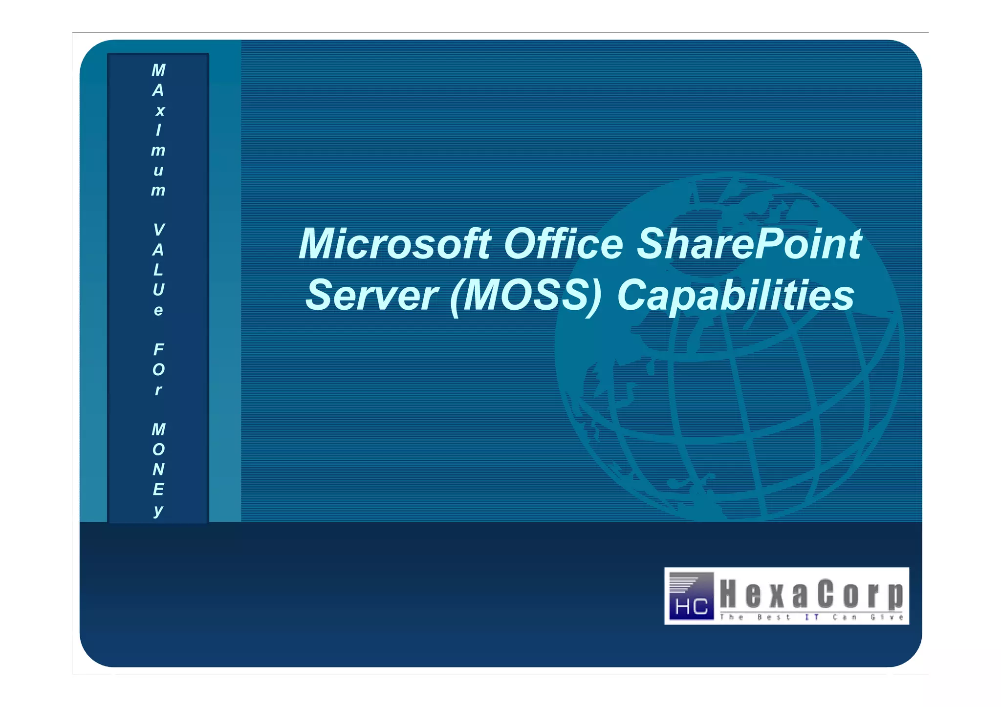 Microsoft Office SharePoint Server (MOSS) provides capabilities for document management, collaboration, and business intelligence. It offers document repositories, workflow automation, and reporting functionality. MOSS can integrate with Microsoft Office applications and other systems. It is a scalable platform for building business applications and sites to improve organizational efficiency.
