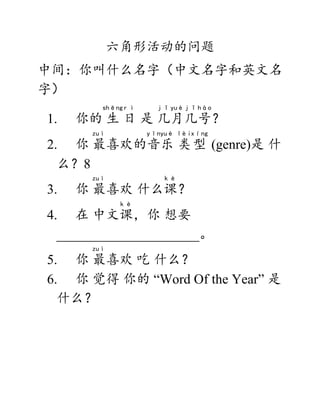文档包含六角形活动的问题,涉及参与者的名字、生日、音乐喜好、最喜欢的课及食物等个人信息。这些问题旨在促进交流和互动。参与者还需分享他们的年度关键词。