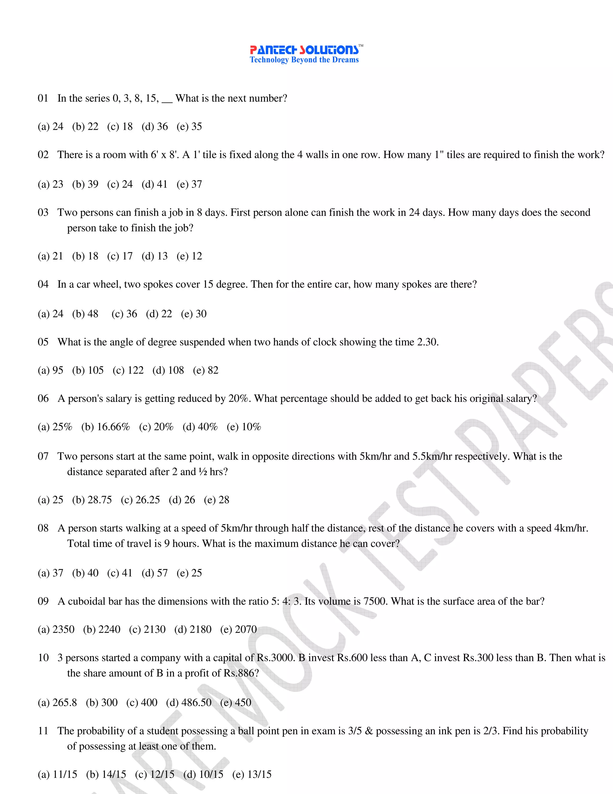 The document consists of a series of mathematical and logical questions, including number sequences, geometry, probability, and word problems, aimed at testing various problem-solving skills. Each question presents multiple choice answers, offering a range of options for individuals to select from. The questions cover diverse topics, including mathematics, vocabulary, and reasoning to assess knowledge in these areas.