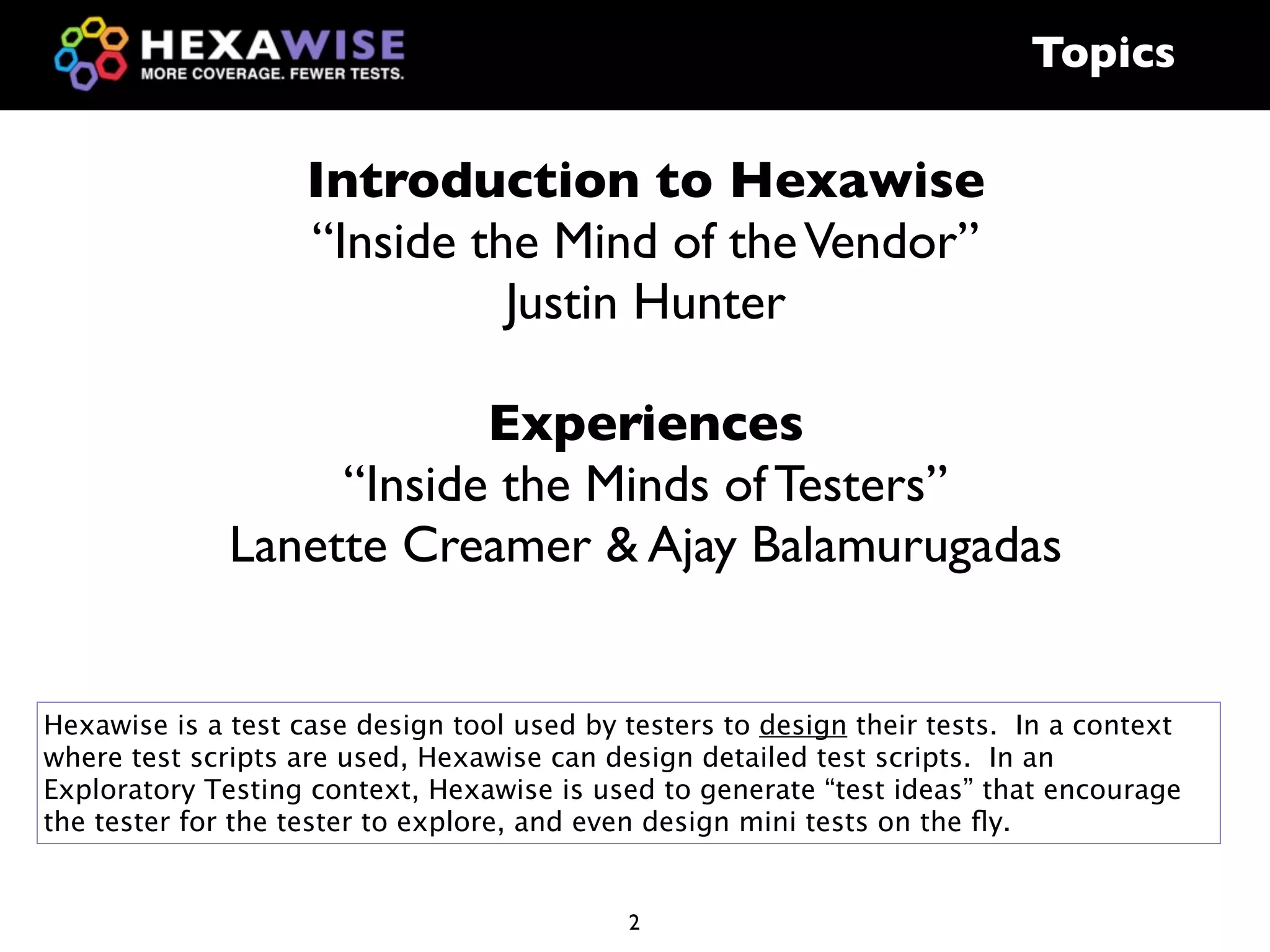 The document summarizes a presentation about Hexawise, a test case design tool. It discusses: