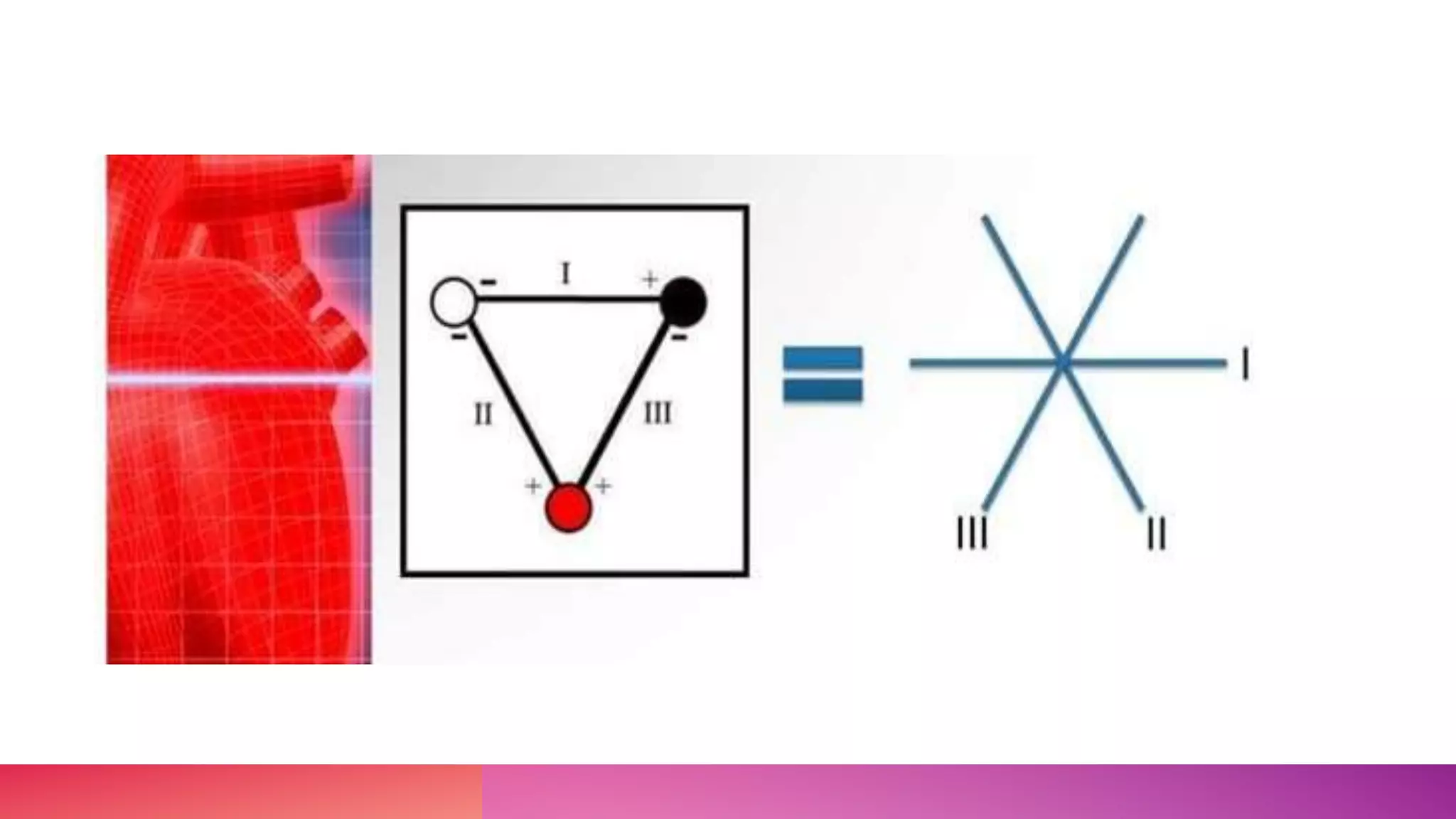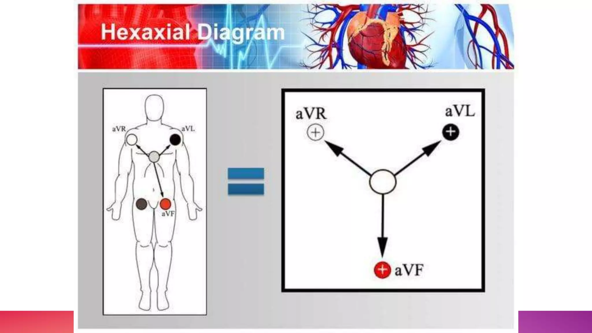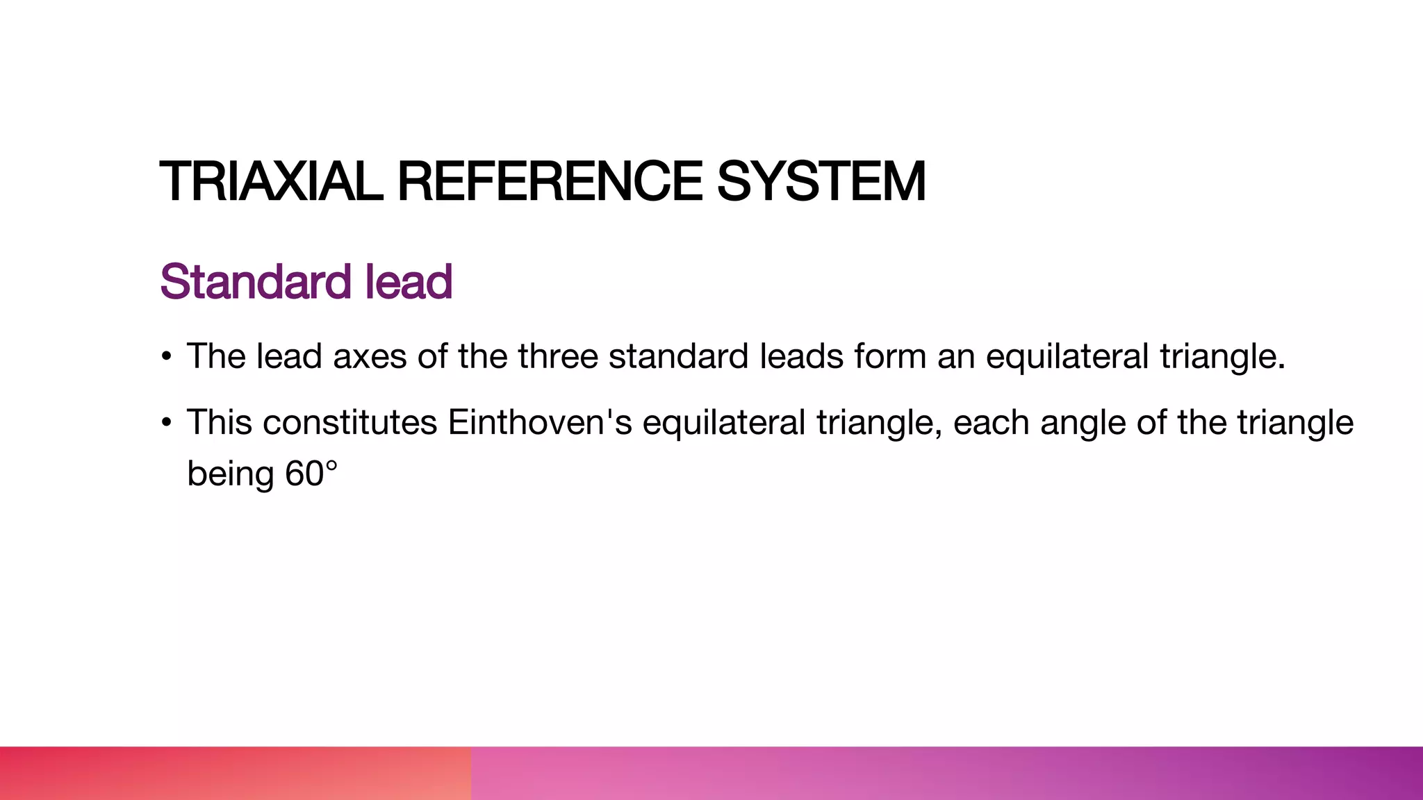 The document discusses the triaxial and hexaxial reference systems used in electrocardiography, specifically focusing on the standard lead configuration forming Einthoven's equilateral triangle. It explains the construction of unipolar leads that bisect this triangle's angles and the resulting combined hexaxial reference system that graphically represents electrical axes in the frontal plane. It also describes the confusing convention used for labeling degrees in the hexaxial system.