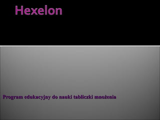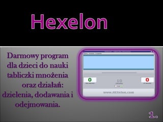 Hexelon Nowe 1. 2. 3. 4. Komunikuje się z dziećmi głosem lektora. Uczy przez powtarzanie. Koryguje wynik gdy dziecko poda niewłaściwą odpowiedź. Wystawia oceny. 5. Celem programu jest nauka dzieci, by automatycznie udzielały poprawną odpowiedzi. Program uczy skutecznie dzięki bodźcom działającym zarówno na wzrok i na słuch. 6. 7. 8. 9. 10. 11. 12.