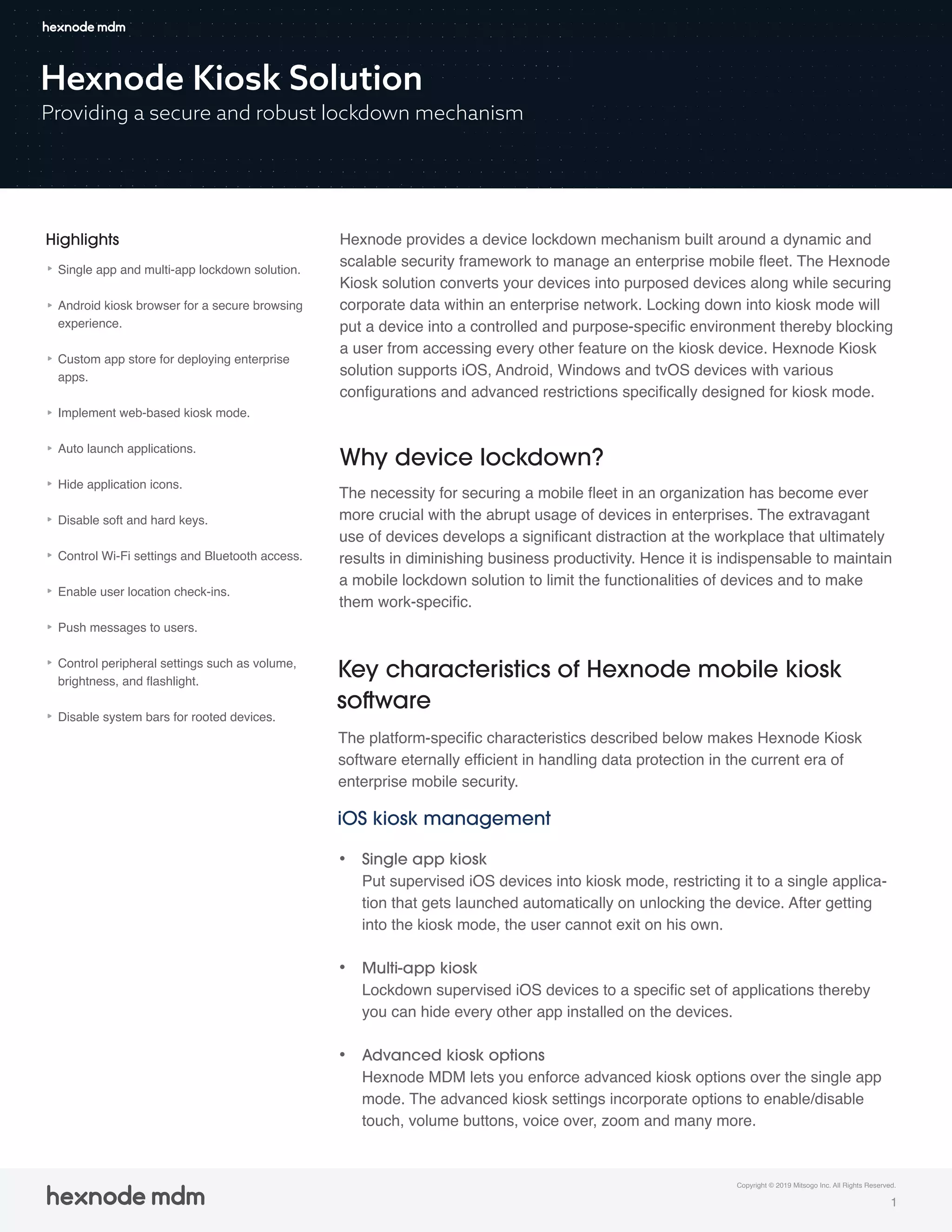 The Hexnode Kiosk Solution offers a robust lockdown mechanism for mobile devices, transforming them into purpose-specific devices to enhance workplace productivity and security. It supports single and multi-app kiosk modes across various platforms including iOS, Android, Windows, and tvOS, allowing for remote management and control of device functionalities. Key features include a custom app store, web browsing restrictions, peripheral controls, and location tracking to secure corporate data within an enterprise network.