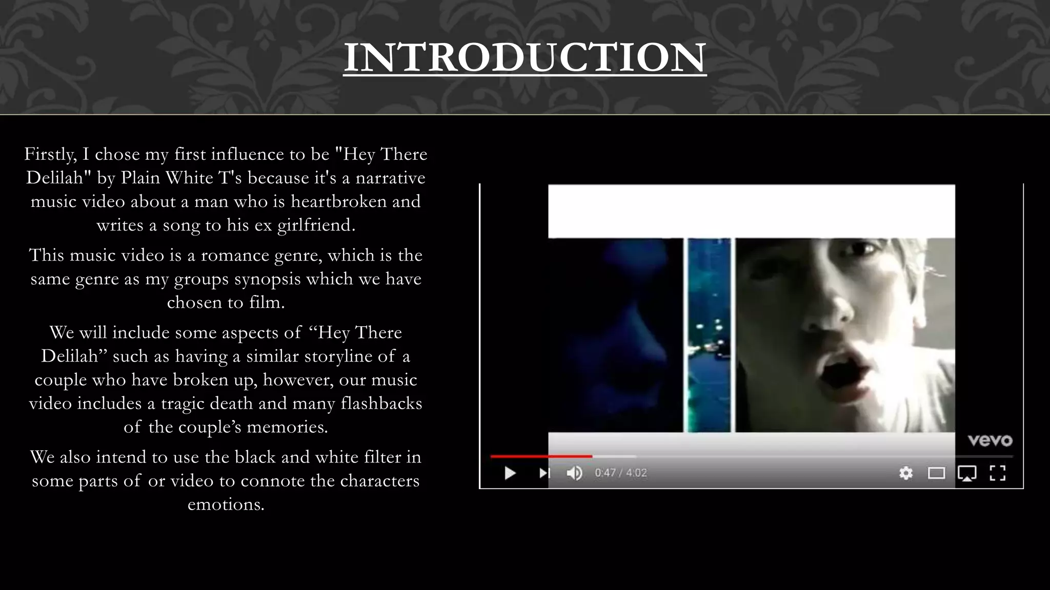 This music video tells the story of a man who writes a song for his ex-girlfriend after a breakup. It uses a black and white filter and dim lighting to convey sadness. Shots of the isolated man contrast with those of the woman in crowds, representing their different ways of dealing with the split. Elements like the guitar and empty room symbolize the man's loneliness, while the woman's clothing and location among others aim to help her blend in and move on.