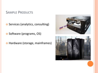 This document provides an overview of International Business Machines Corporation (IBM). It discusses IBM's products and services which include analytics, software, and hardware. It outlines IBM's financial goals and history dating back to 1911. The document also describes IBM's shift towards cloud computing, competition from other companies, strategies around prediction and adaptation, current popular products involving Twitter data analytics, and a prediction that IBM may need restructuring going forward.
