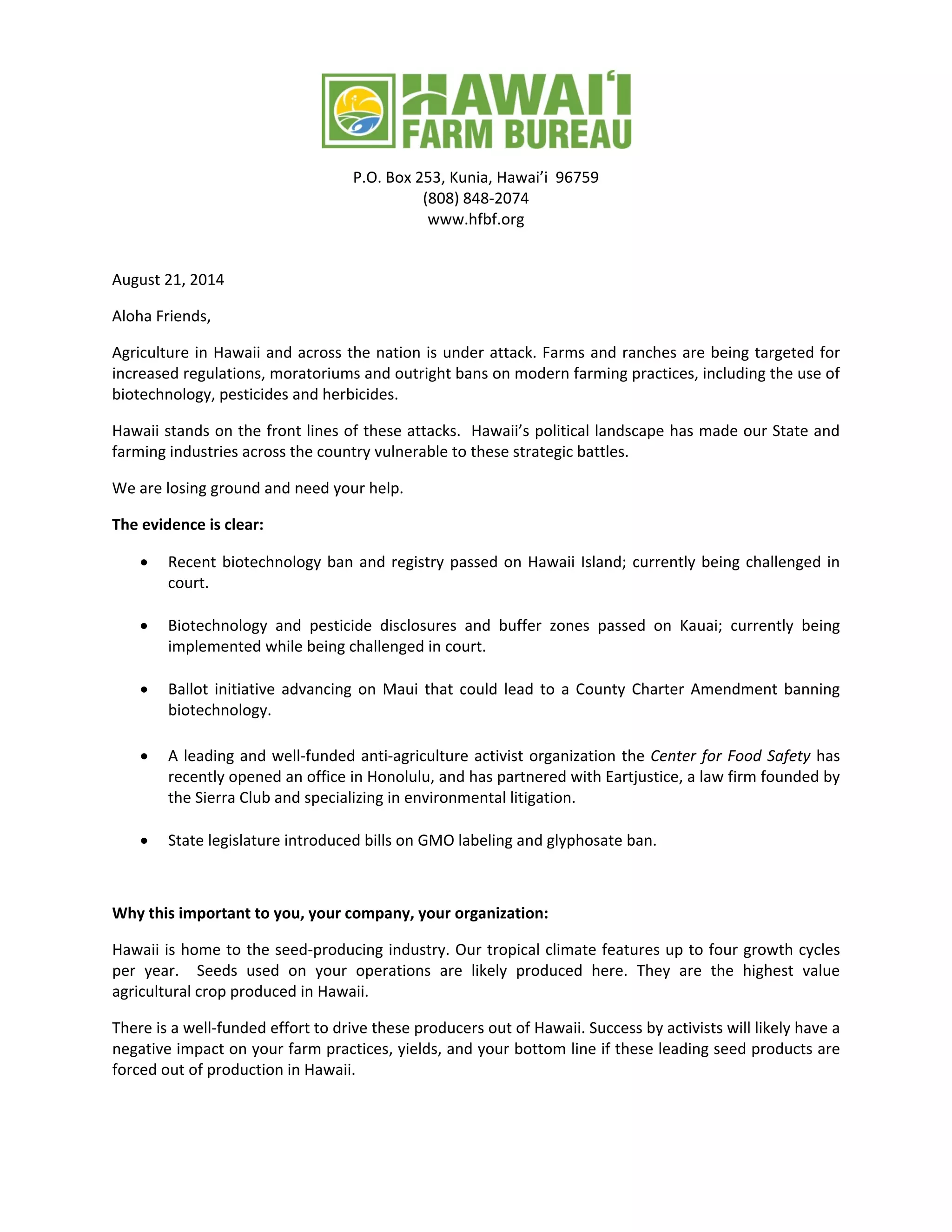 The Hawaii Farm Bureau Federation is launching a public relations campaign called "Small Farmers, Big Stories" to counter increasing attacks on modern agricultural practices in Hawaii from anti-agriculture activists. The $400,000 yearly campaign will tell the stories of farmers through print, radio, television, and social media to build public support for agriculture. It aims to attract young people to farming careers and shift public perception in favor of farmers and their practices.