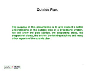 The document provides an overview of the outside plant of a broadband system. It discusses how the system uses satellites spaced every 2 degrees above Earth to transmit signals via C-band and L-band frequencies. It then outlines the various components of the outside plant including fiber optic and coaxial cable sections, poles, stands, clamps, anchors, and other hardware used to support and transmit signals throughout the network. Diagrams and photos illustrate the setup and layout of the outside broadband infrastructure.