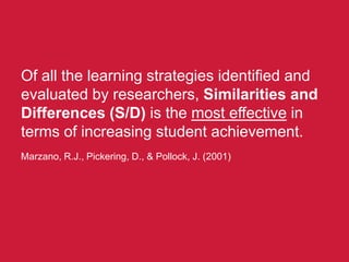 The document discusses the similarities and differences (S/D) learning strategy. It finds S/D to be the most effective strategy for increasing student achievement, generating a 45% increase. S/D works well because it allows students to build on prior knowledge, review material again when learning a second item, and creates strong memory bonds between items. The document provides a step-by-step process for implementing S/D, including gathering information, organizing it using tools like Venn diagrams, drawing conclusions through discussion, and applying the conclusions reached.