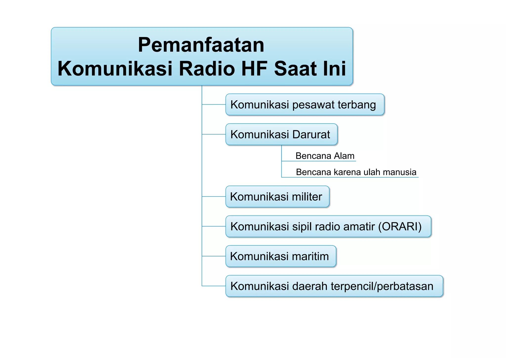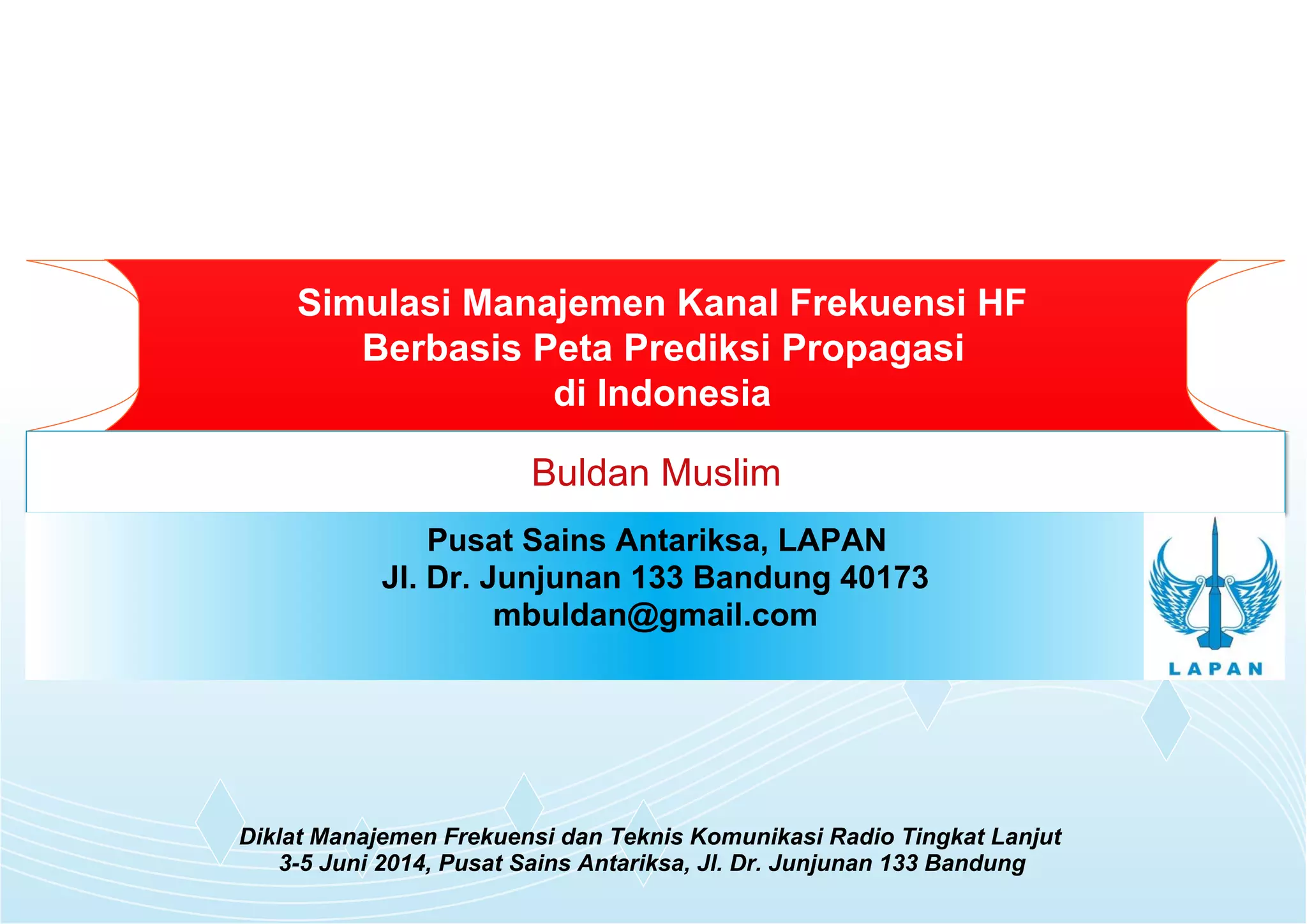 Dokumen membahas tentang simulasi manajemen kanal frekuensi HF dengan peta prediksi propagasi di Indonesia, serta manfaatnya dalam komunikasi darurat, militer, dan bencana. Model Simplified Ionosphere for Low Latitude Region of Indonesia (MSILRI) dikembangkan untuk memberikan prediksi harian dan bulanan terkait frekuensi HF. Kemandirian dalam sains antariksa dan pemanfaatan teknologi komunikasi radio diharapkan dapat ditingkatkan melalui aplikasi model ini.