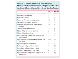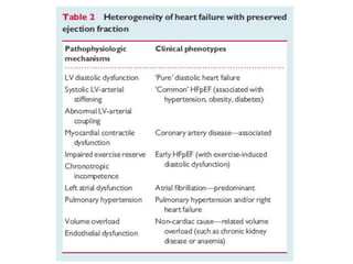This document discusses heart failure with preserved ejection fraction (HFpEF), formerly known as diastolic heart failure. It provides background on HFpEF versus systolic heart failure and explores the pathophysiology and management of HFpEF. Key points include: