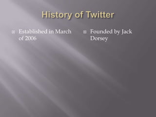 This document provides an overview of Twitter and how companies can use it for marketing. It discusses Twitter's history and features, noting it was founded in 2006 and allows posting of text, photos, and videos. The document then outlines several interesting facts about Twitter's growth and usage. It also describes how companies can benefit from marketing on Twitter by gaining customer attention, understanding brand sentiment, and targeting specific audiences. While competition can be challenging, the conclusion asserts that social media marketing will become increasingly important as more people engage with platforms like Twitter.