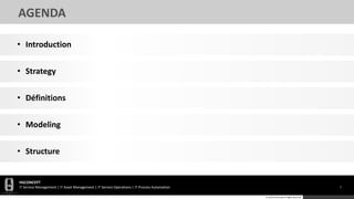 This document discusses service design in ITSM and how to align business services with enterprise architecture. It provides definitions of key terms like enterprise architecture, IT service management, and service catalog. It describes modeling business, application, and technology services in different layers. The document outlines steps to define a service, including identifying business objectives, setting attributes with owners, integrating data sources, and automating data reconciliation. It also discusses service relationships, attributes, ownerships, and using ServiceNow for service management.