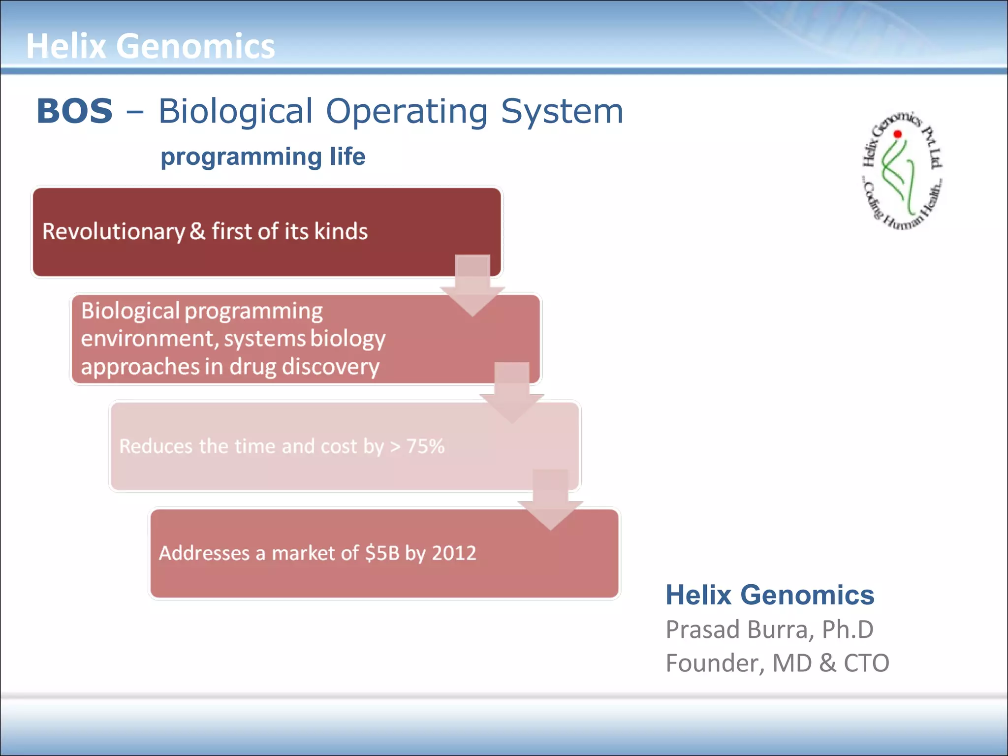 Helix Genomics introduces a Biological Operating System (BOS) designed to streamline drug discovery and bioinformatics through customizable, scalable tools that integrate multiple functions and reduce unproductive time. The document outlines the market challenges in bioinformatics, emphasizing the need for standardization and the potential growth of analytical software in the sector. Helix Genomics aims to dominate the bioinformatics landscape by becoming a one-stop solution for biological programming and data management.