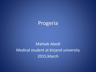 Progeria, also known as Hutchinson-Gilford Progeria Syndrome, is an extremely rare genetic disorder causing rapid aging in children. It is caused by a mutation in the LMNA gene producing abnormal lamin A protein called progerin. Children with Progeria appear normal at birth but show signs of aging including hair loss, stiff joints, and cardiovascular problems. They typically die of heart attacks or strokes in their early teens. In 2012, the first drug treatment using farnesyltransferase inhibitors was discovered, showing promise in reducing progerin and improving flexibility of blood vessels and other symptoms for children in clinical trials.