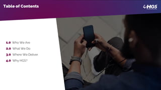 This document provides an overview of HGS, a global outsourcing company that provides business process optimization, digital transformation, customer engagement, and automation services. It details HGS' vision, capabilities across various industries, global footprint with 75 centers in 7 countries, award-winning work, and focus on intelligent innovation and customer-first approach to create value for its clients.