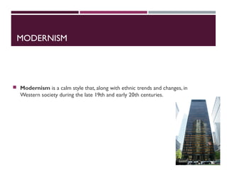 The document provides definitions for various art styles and genres, including modernism, international style, postmodernism, grunge, op-art, pop-art, art nouveau, punk, urban art, anime, kitsch, photorealism, futuristic, cartoon, factual, editorial, lifestyle, adventure, sports, corporate, fashion, fantasy, simulation, tabloid, science fiction, and graphic novel. It concisely summarizes each term and provides one example for some terms.