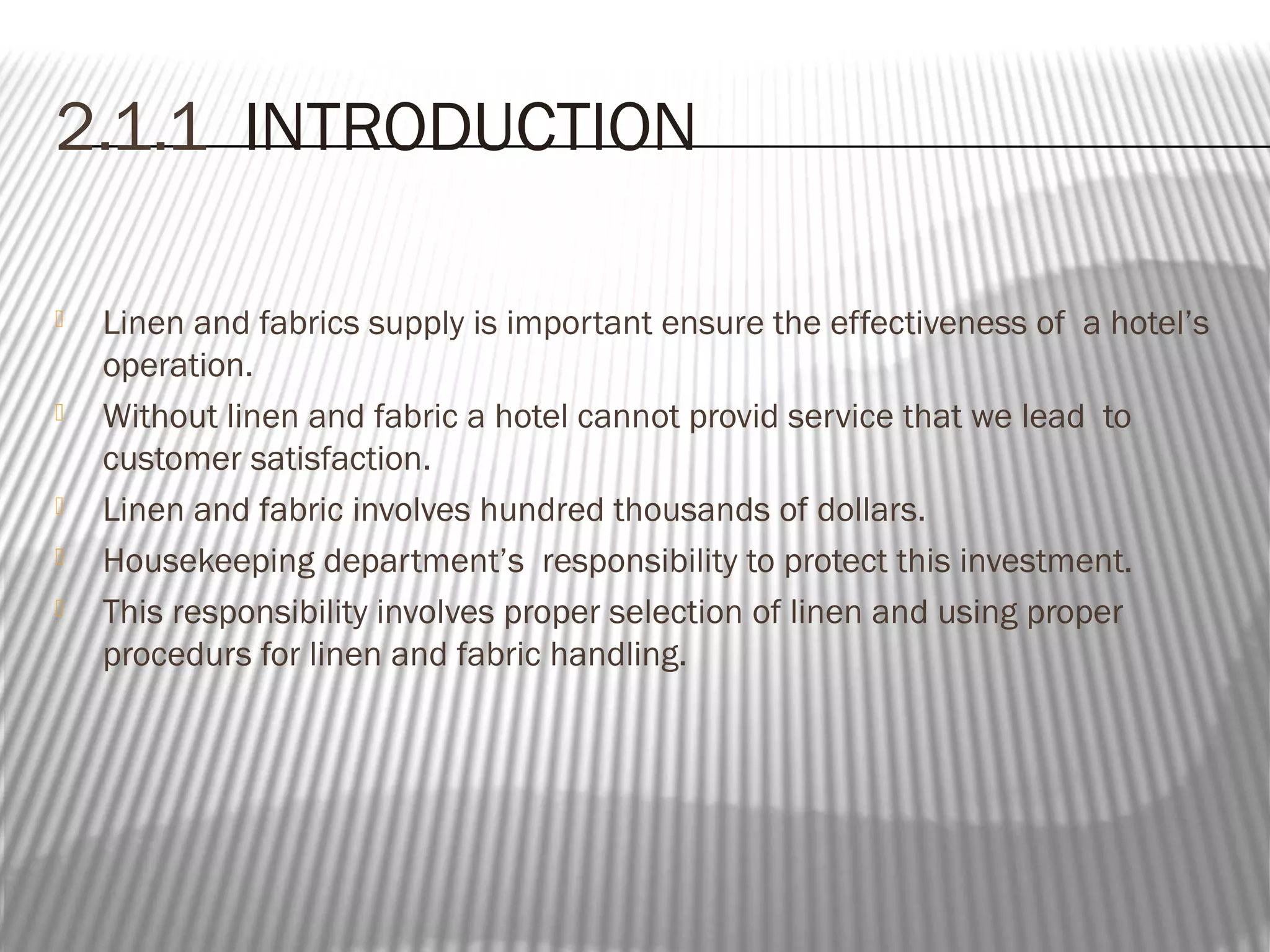 The document discusses linen and fabric handling in housekeeping management. It defines linen as cloth made from flax and fabrics as materials made by weaving or knitting fibers. The housekeeping department is responsible for properly selecting, handling, and caring for linen and fabrics, which can involve hundreds of thousands of dollars. Labels are attached to fabrics to provide care instructions and allow for proper sorting and washing to protect the quality and appearance of the textiles.