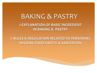 The document provides an overview of key ingredients in baking and pastry, detailing the functions of fats, sugars, flours, leavening agents, and eggs. It explains how each ingredient contributes to texture, flavor, and overall product quality, along with guidelines for food safety, hygiene, and sanitation practices in the kitchen. Additionally, it covers the types of fats, sugars, and flours used in baking along with their specific characteristics and functions.