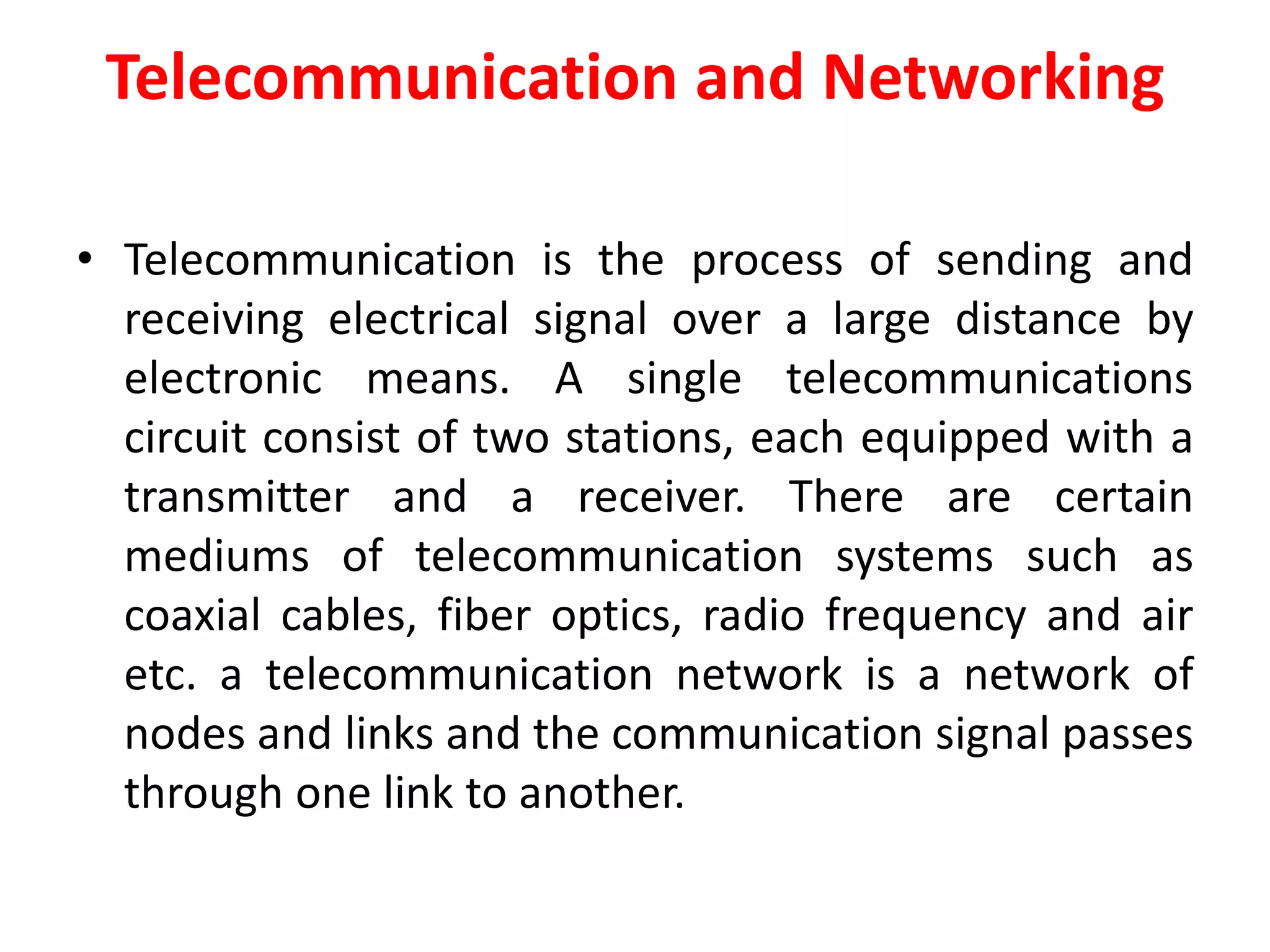 - Telecommunication involves sending and receiving electrical signals over long distances electronically using mediums like cables, fiber optics, radio frequencies, and air.
