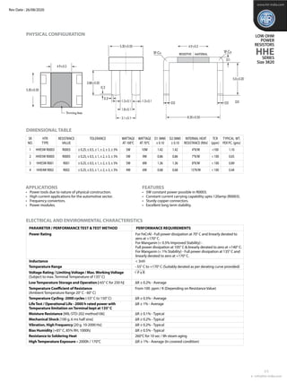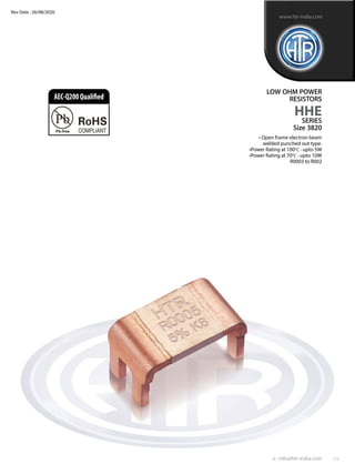 This document summarizes the specifications and characteristics of HHE series low ohm power resistors from HTR-India. Key details include: