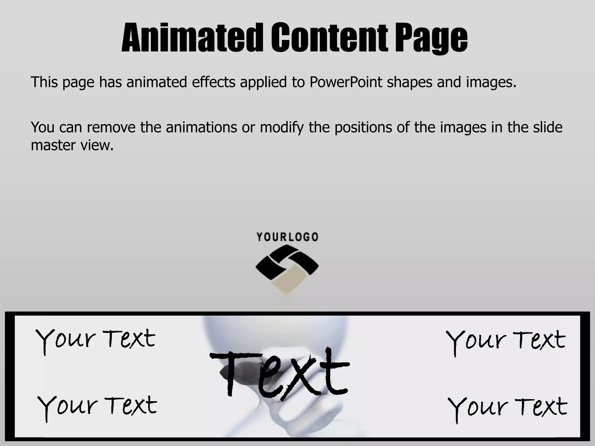 This PowerPoint template page contains information about animated content and effects that can be modified in the slide master view, and it provides guidance on compatibility with different versions of PowerPoint and tips for using images, objects, and placeholders throughout the template. The document also demonstrates various layouts for things like bulleted lists, tables, graphs, and pictures that can be customized. Users are instructed on how to change between static and animated layouts using the ribbon interface.