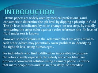 Litmus paper is commonly used to determine the pH level of a fluid by comparing the color of the litmus strip to a reference chart. However, some colors on the chart are similar, making visual identification difficult. The document proposes using a camera phone to take an image of the litmus strip and reference chart. An image processing program on the phone would then match the color of the strip to the chart and display the pH level on the phone screen. This automated method could help those who have trouble visually distinguishing colors, such as the elderly or colorblind individuals.