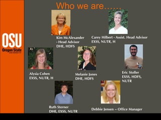 This document provides an overview of an orientation event for students in the College of Health and Human Sciences at Oregon State University. It introduces the advising staff, describes the roles of student ambassadors and peer advisors, and outlines the agenda for the two-day START orientation. The document summarizes the academic departments, majors, and degree requirements within the college. It also provides information about study abroad opportunities, learning communities, and the baccalaureate core requirements. The second day's schedule provides times for departmental advising and registration sessions.
