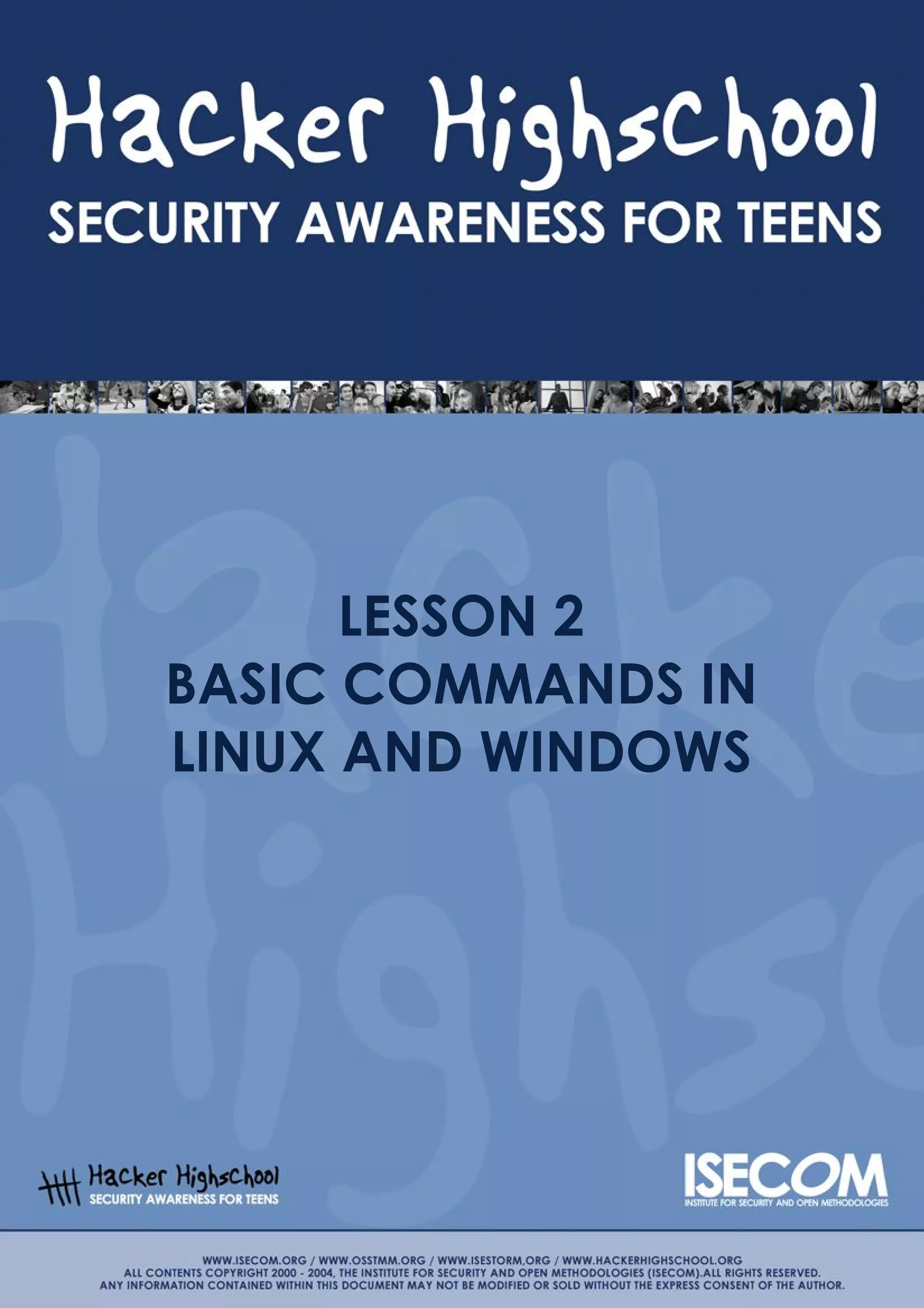This document provides instructions on basic commands in Linux and Windows operating systems. It begins with licensing information and an introduction stating the objectives are to learn basic commands that will be used in exercises. Sections are included on requirements and setup, system operations in Windows and Linux, and exercises for both platforms. The Windows section describes how to open a command prompt and provides details on common commands and networking tools like ipconfig, ping and tracert. The Linux section similarly discusses how to open a console window and provides command and tool details. A table compares basic command equivalences between Linux and Windows.