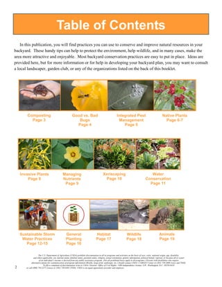The document provides homeowners with easy backyard conservation practices they can implement, including composting, identifying beneficial and harmful insects, integrated pest management techniques, and planting native species. Most of the ideas are simple to adopt and can help protect the environment, support wildlife, and beautify properties. The publication includes tips, instructions, and resources on various topics to help homeowners develop conservation plans for their backyards.