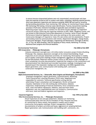 Holly Wells is an experienced assistant project manager and environmental health and safety manager with 21 years in the field. Her expertise encompasses environmental health, project management, contract oversight, and adherence to safety regulations across various roles in different organizations. She has a strong educational background in business administration and holds multiple relevant certifications.
