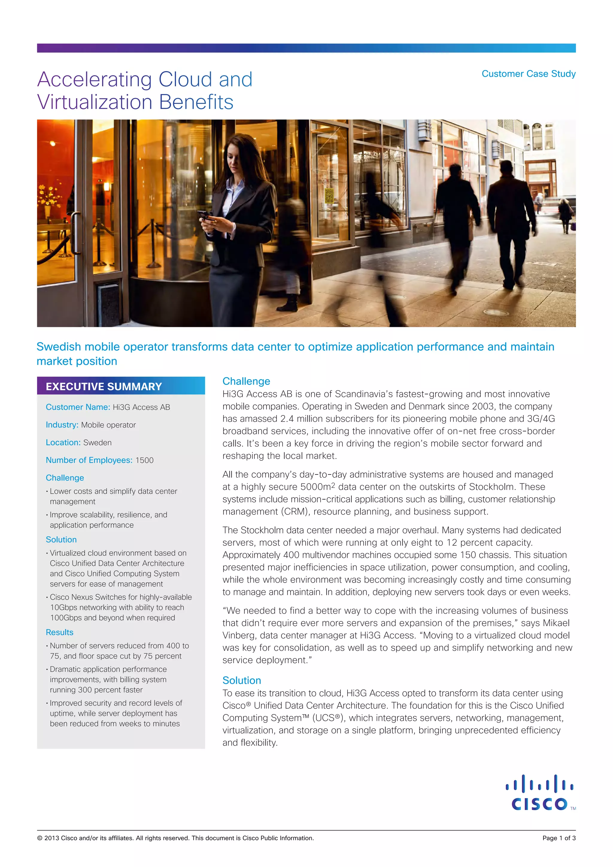Hi3G Access AB, a leading mobile operator in Scandinavia, transformed its inefficient data center into a cloud-based virtualized environment, significantly reducing the number of servers from 400 to 75. This overhaul improved application performance, cutting billing processing time from 27 hours to less than 9, and decreased operational costs by 50-60%. With enhanced scalability and resilience, the operator is now well-positioned to adapt to market demands and deliver innovative mobile services efficiently.
