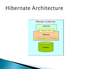 Hibernate is an open source Java framework that allows developers to work with relational databases in an object-oriented way. It provides tools for object relational mapping, query languages, caching and transaction management. Hibernate supports many relational databases and provides a way to develop database independent applications. It allows developers to focus on application development without worrying about low level database operations like queries, result sets etc.