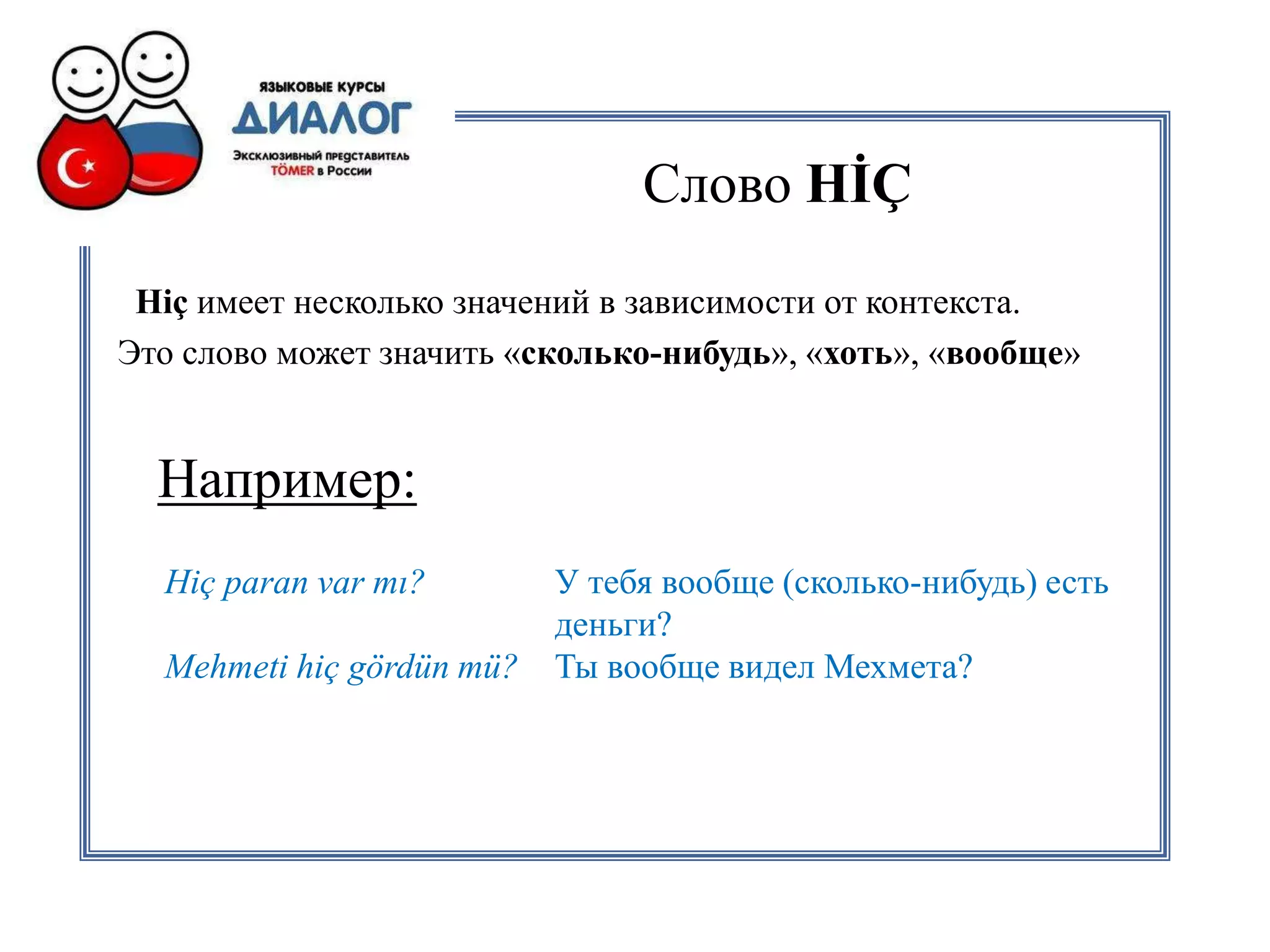 Слово hi̇ç в турецком языке имеет несколько значений в зависимости от контекста. Оно может означать 'сколько-нибудь' в утвердительных предложениях и 'совсем не' в отрицательных. Также hi̇ç используется для образования отрицательных слов, таких как 'никто' и 'никогда'.