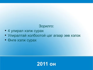 2011 он Зорилго:4 улирал хэлж сурах Улиралтай холбоотой цаг агаар зөв хэлэх Өнгө хэлж сурах きせつ - 2.