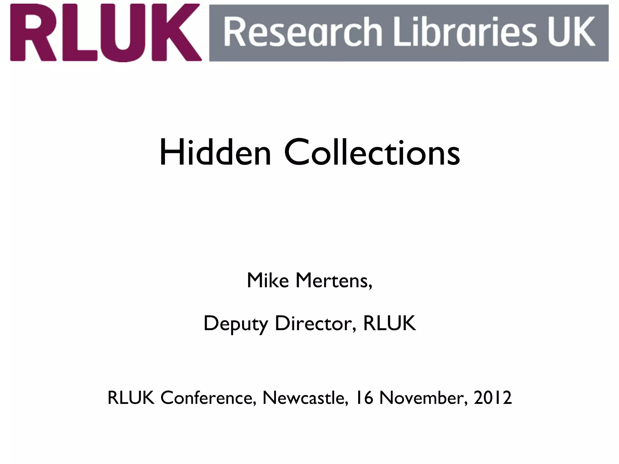 The document summarizes the findings of a survey on hidden collections in UK libraries. It found that over 13 million volumes across 77 responding institutions remain uncataloged, with some collections over 100 years old. Specific formats like maps, photographs, and foreign language materials made up a large portion of the backlogs. There was support for creating a national registry of collection-level descriptions to help prioritize retroactive cataloging efforts and make these hidden collections more accessible. However, others were skeptical that a new report would lead to real changes without a coordinated national strategy.