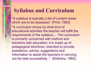 The document discusses definitions of curriculum from various academics. A curriculum is more than just a syllabus, which lists content to be assessed, but also includes the methods and educational activities used by teachers. It typically includes objectives, content selection and organization, implied or explicit learning patterns, and an evaluation program. Curriculum also encompasses all the planned learning experiences for students under school guidance. There is no single agreed-upon definition of curriculum.