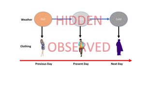 Hidden Markov models (HMMs) are probabilistic graphical models that allow prediction of a sequence of hidden states from observed variables. HMMs make the Markov assumption that the next state depends only on the current state, not past states. They require specification of transition probabilities between hidden states, emission probabilities of observations given states, and initial state probabilities to compute the joint probability of state sequences given observations. The most probable hidden state sequence, determined from these probabilities, is taken as the best inference.