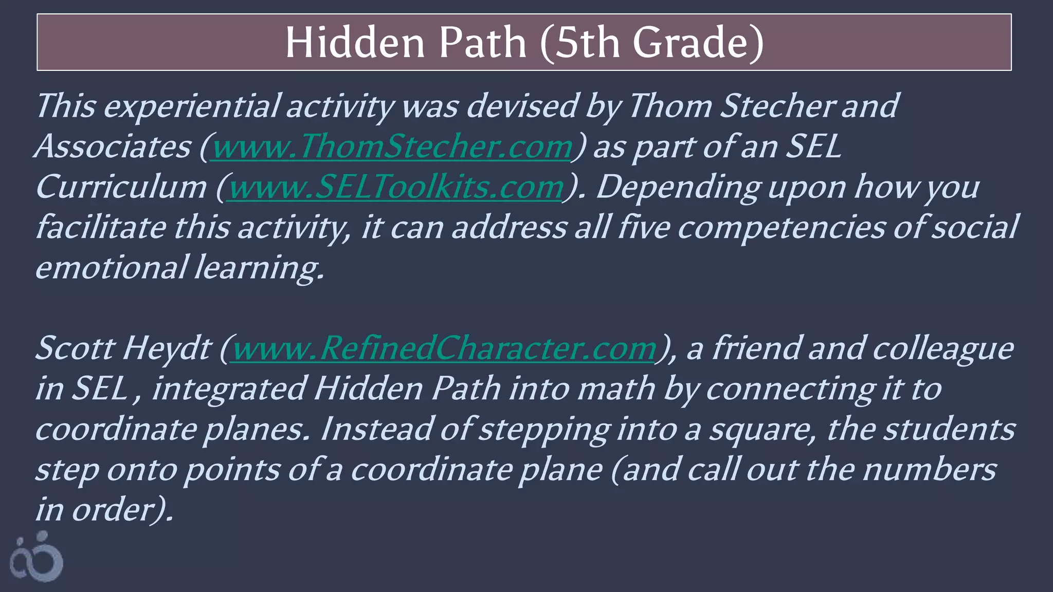 This activity involves students navigating an unmarked "hidden path" across a grid of squares. One student at a time steps onto squares trying to reveal the path through trial and error, while others observe. The goal is teamwork and developing social-emotional skills like self-motivation, decision making, and providing support to others. The activity can be processed to discuss what skills students practiced and how to apply them in other contexts. It has also been adapted to integrate math concepts like coordinate planes. The difficulty can be varied through adjustments to the grid size, rules, number of participants and complexity of the path.