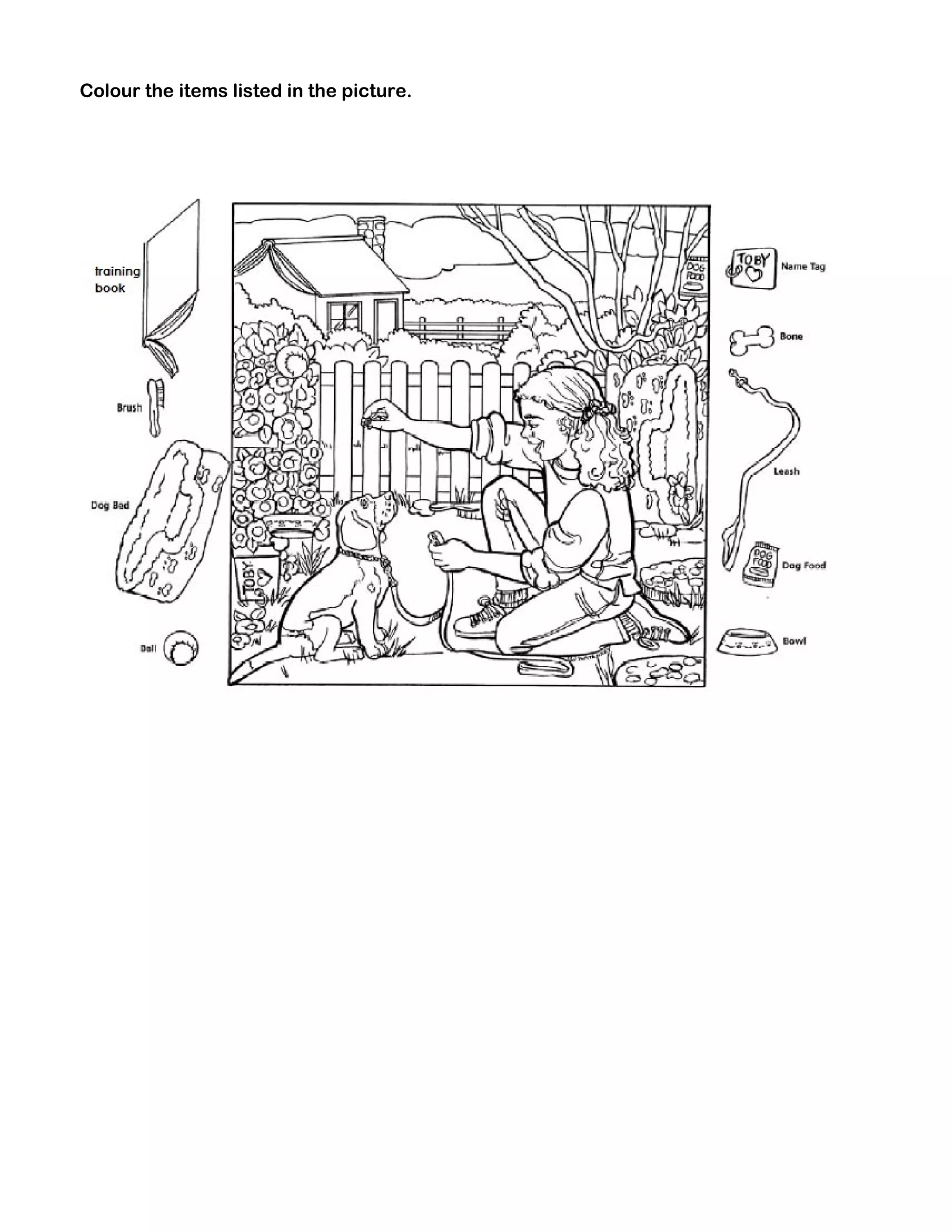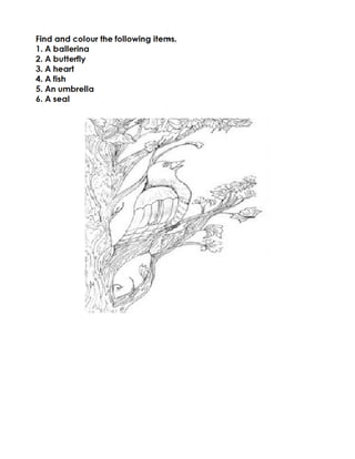 The document provides instructions to color 13 items shown in a picture, including a baseball cap, turtle, fish, duck, needle, nail, ice-cream cone, butterfly, boot, spoon, cane, ring, and scissors.